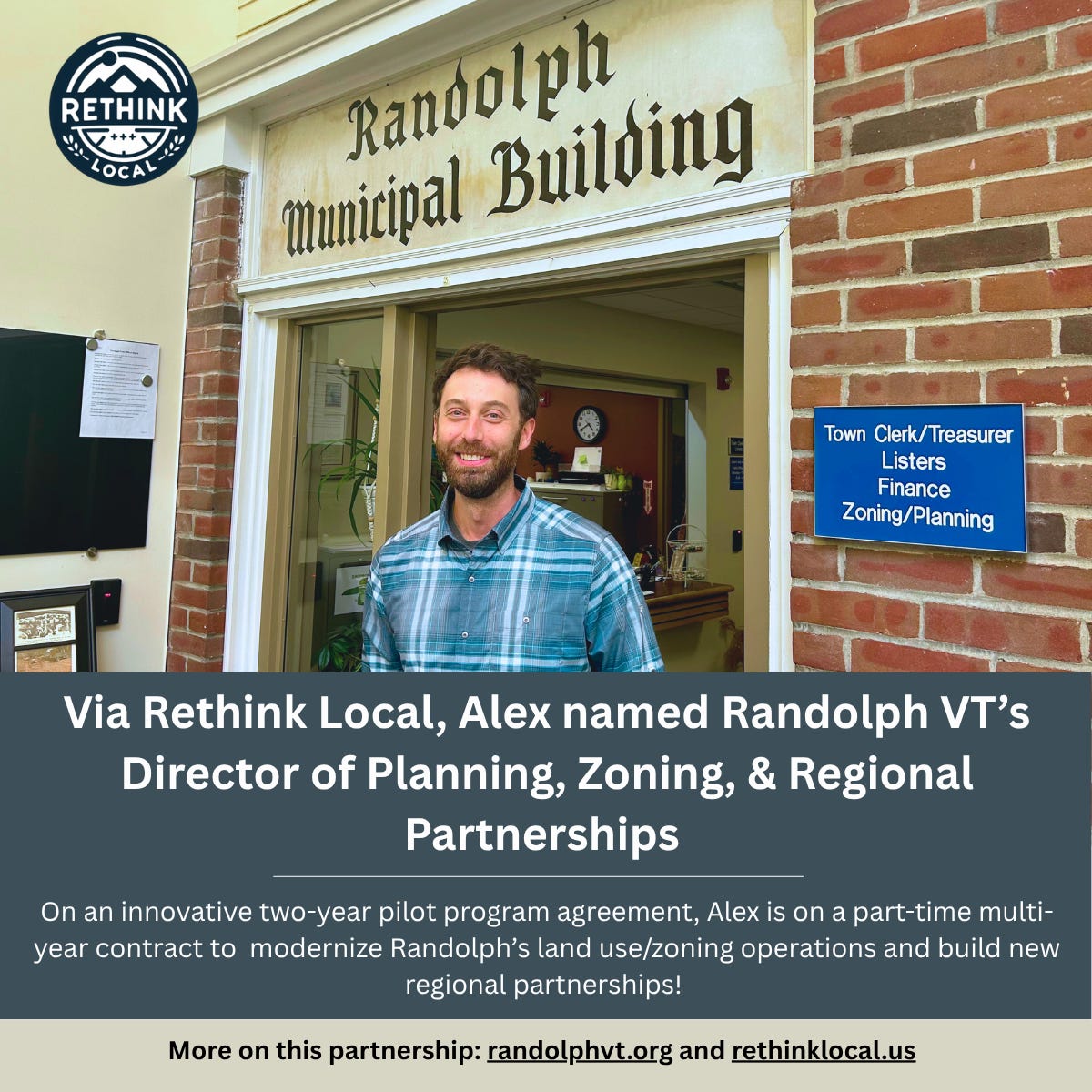 In a new partnership through Rethink Local, I'm serving as Director of Planning, Zoning, and Regional Partnerships on a part-time, multi-year contract with the Town of Randolph